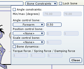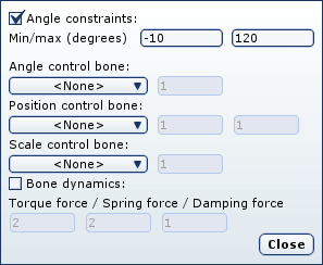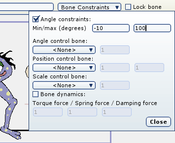Для установки ограничения на угол поворота для этой кости, необходимо установить значения информационной панели кости (Bone Info) так, как показано на рисунке ниже. Поставьте галочку напротив свойства "Angle constraints" (Ограничения слоя) и установите минимальный и максмальный углы поворота -10 и 100.